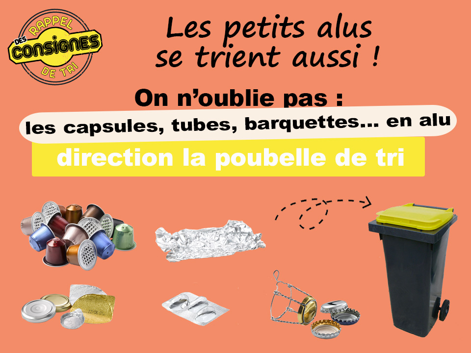 Les petits alus, comme les capsules de café, les couvercles de bocaux, les opercules de bières, les emballages en aluminium de fromage ou de beurre… direction le bac jaune et la colonne de tri.