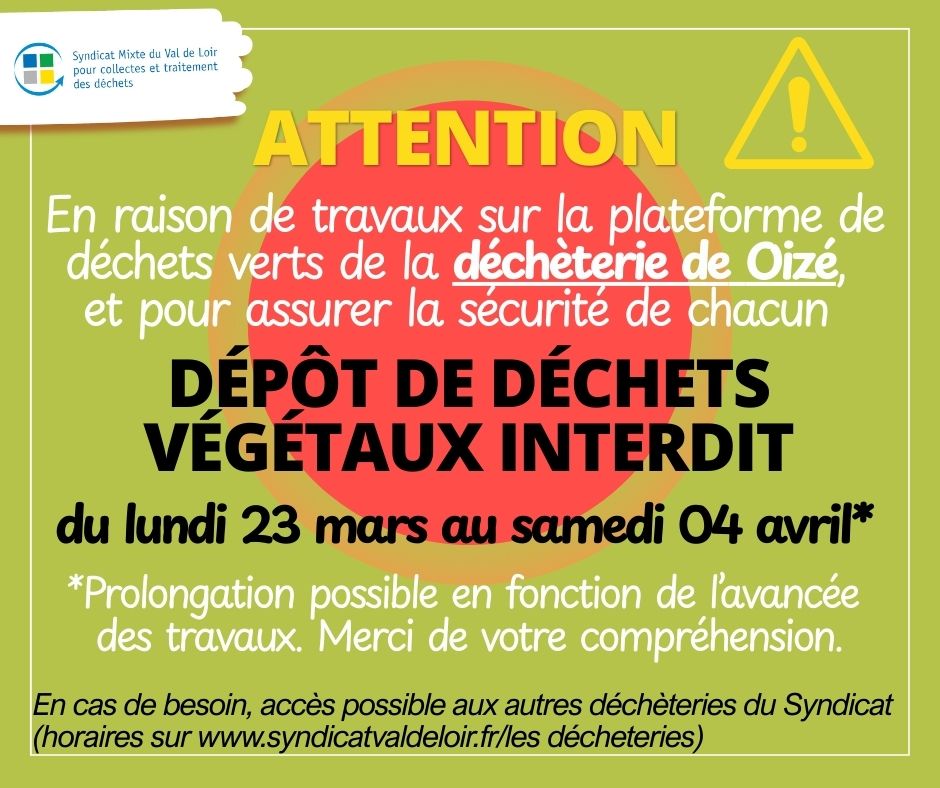 En raison de travaux sur la plateforme des déchets verts de la déchèterie de Oizé, le dépôt de déchets végétaux est interdit du lundi 23 mars au samedi 04 avril.
